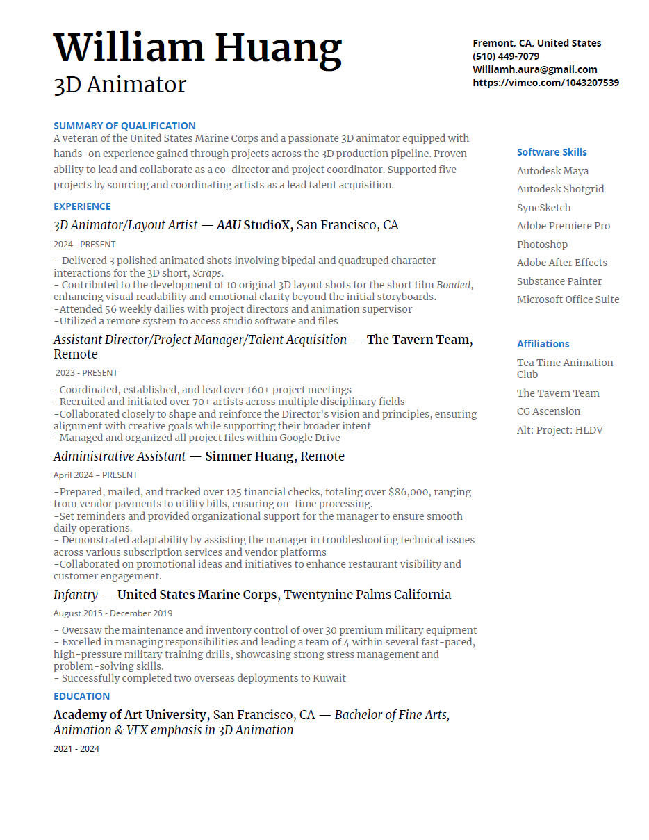 Greetings! My name is William Huang, a deeply passionate 3D animator in the pursuit for greater heights in the realm of storytelling and visual spectacle. My creative journey started at a young age fueled by the immersive culture of Japanese anime. While my skills have grown in the 3D realm, the influence of Japanese anime continues to shape my creative vision in various ways. I also had the honor to serve in the United States Marine Corps that instilled in me invaluable traits of discipline, resilience, and leadership. It was an experience that profoundly shaped me, pushing me to grow and adapt to a wide range of situations. While pursuing my degree in 3D Animation at the Academy of Art, I had the opportunity to volunteer for several ambitious CG feature projects, taking on essential roles such as Talent Acquisition, Project Manager, and Assistant Director to support the success of each project. I’ve developed a strong eye for talent, a commitment to detailed project coordination, and a collaborative spirit. Today, I draw on these influences and experiences to craft my animation and ignite the imagination of everyone as it has done for me